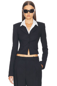 Details - 58% nylon, 39% cotton, 3% elastane - Made in China - Dry clean only - Front button closure - Padding at shoulders and buttoned cuffs - Side flap pockets - Crepe fabric - Our Style No. HLSA-WO30 - Manufacturer Style No. HEOW45 F24