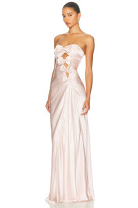 Details - Satin textile - Dry clean recommended - Unlined - Hidden back zipper closure - Front cut-out detail with bow details - Ruched satin fabric - Made in China - Our Style No. HLSA-WD239 - Manufacturer Style No. HED10006 U25