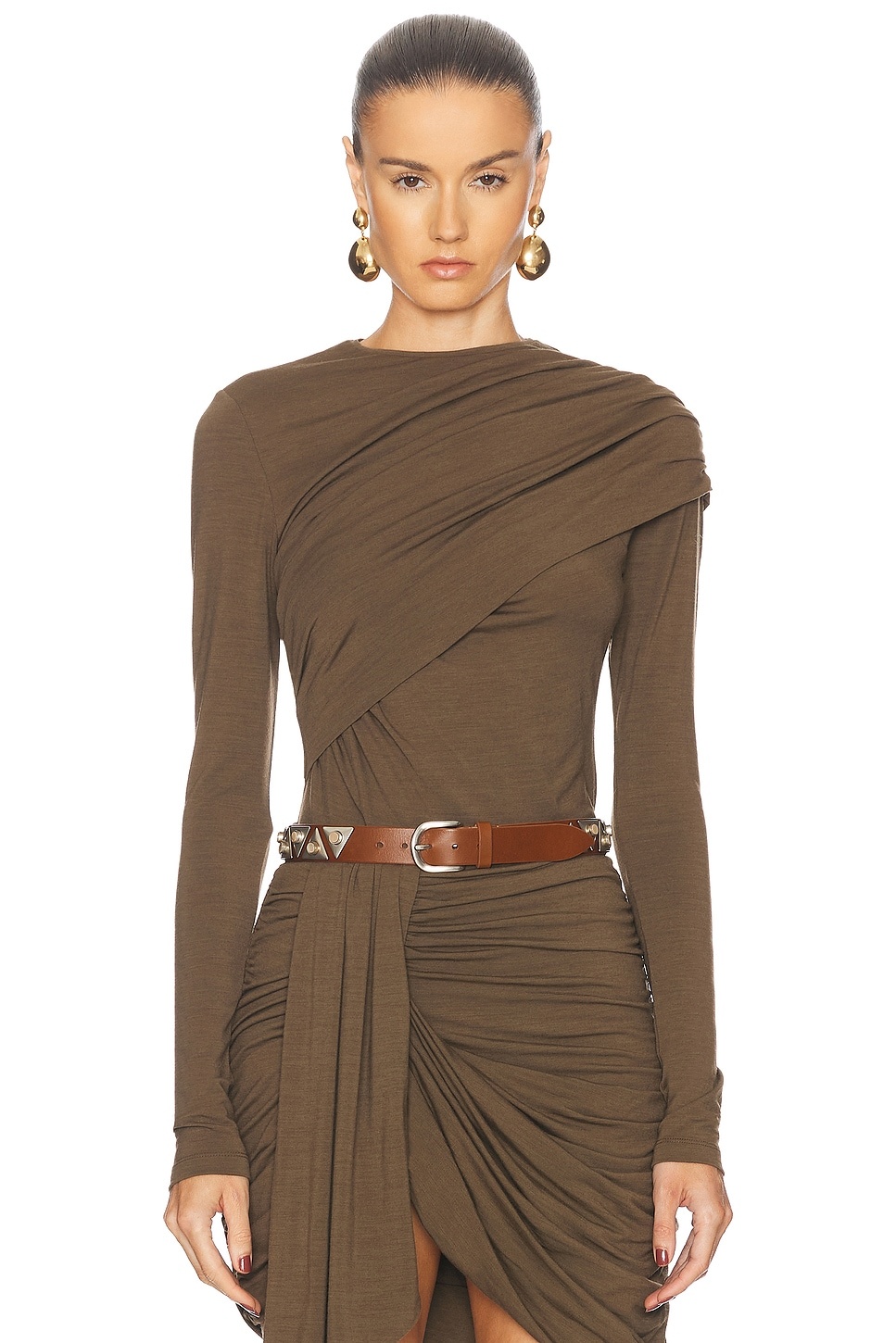 Details - 51% viscose, 41% wool, 8% elastane - Made in Poland - Machine wash - Pull-on styling - Draped fabric over shoulder styling - Jersey fabric with ruching detail - Item not sold as a set - Our Style No. ISAB-WS484 - Manufacturer Style No. HT0515FA-B4K01I