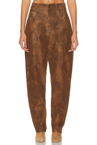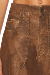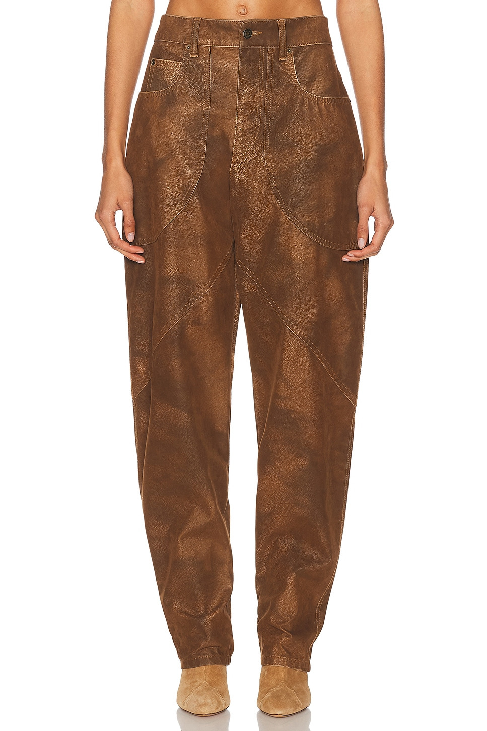 Details - Faux leather textile - Professional leather clean recommended - Zip fly and button closure - 5-pocket design - Contrast logo patch at back waistline - Midweight faux leather fabric with intentional fading - 51 cm at the knee narrows to 38 cm at the leg opening - Made in Tunisia - Our Style No. ETOI-WP70 - Manufacturer Style No. PA0556FA-C3B01E