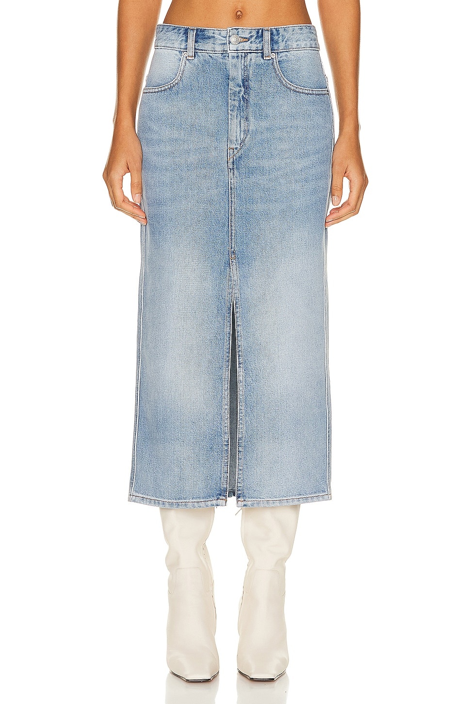Details - Self: 100% cotton - Lining: 65% polyester, 35% cotton - Made in Tunisia - Machine wash - Unlined - Zip fly with button closure - 4-pocket styling - Back Isabel Marant patch - Rigid denim fabric with front slit - Our Style No. ISAB-WQ146 - Manufacturer Style No. JU0136FA-B1H04I