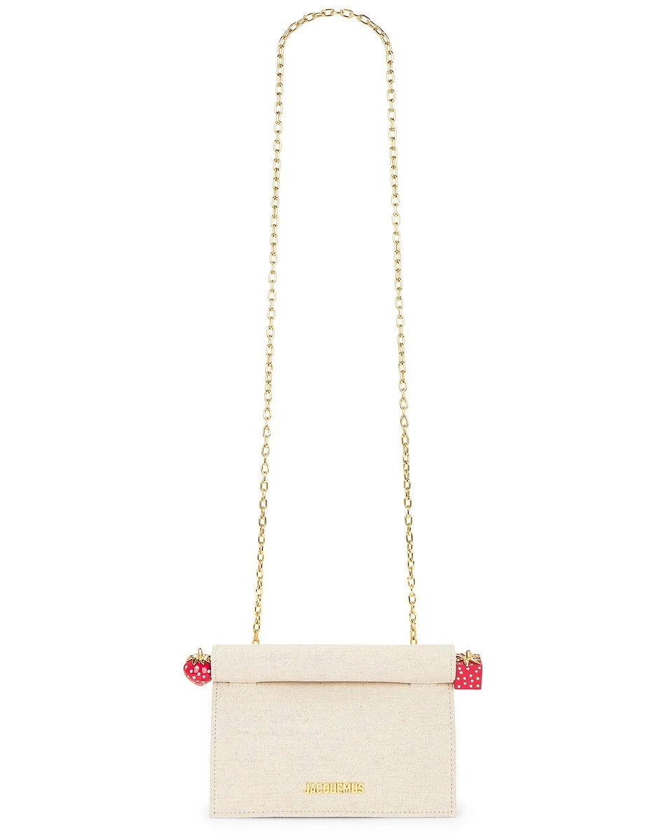Details - Self: 44% Cotton, 44% Linen, 12% Acrylique - Second: 100% Lamb leather - Lining: 100% Cotton - Roll top with magnetic closure - One main compartment - One inner card pocket - One back slip pocket - Acrylic strawberry style embellishment with diamond-like detail - Measures approx 19 cm W x 15 cm H x 6 cm D - Made in Italy - Our Style No. JQUF-WY413 - Manufacturer Style No. 25HBAW00392AW00094
