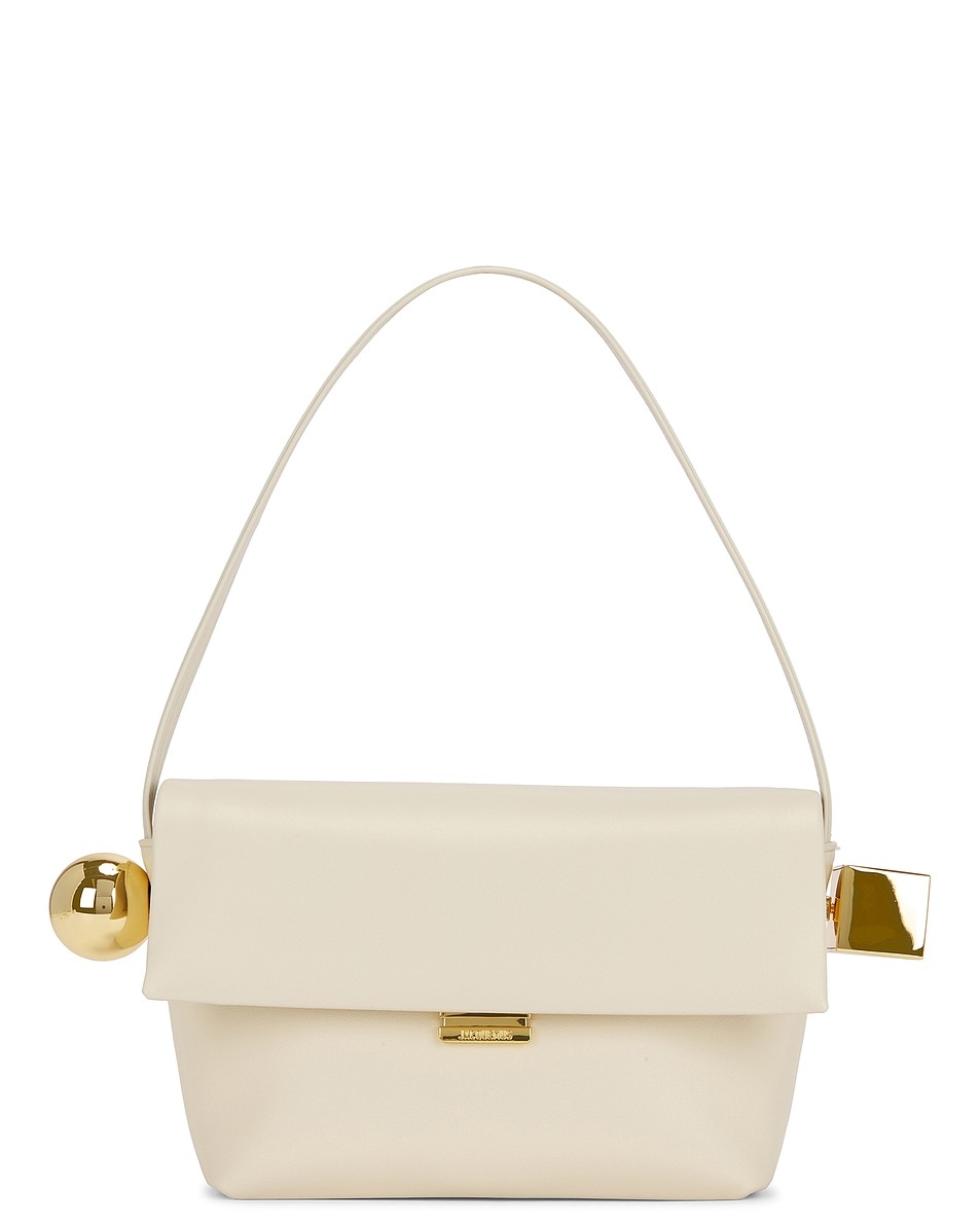 Details - Smooth nappa exterior with bengaline lining - Made in Italy - Fold-over flap top with magnetic closure - Two compartments - Interior slip pocket - Interior zipper pocket - Exterior slip pocket - JACQUEMUS logo hardware at front - Gold-tone metal sphere and square hardware - Measures approx 20 cm W x 17 cm H x 11 cm D - Our Style No. JQUF-WY385 - Manufacturer Style No. 24H243BA383-3171