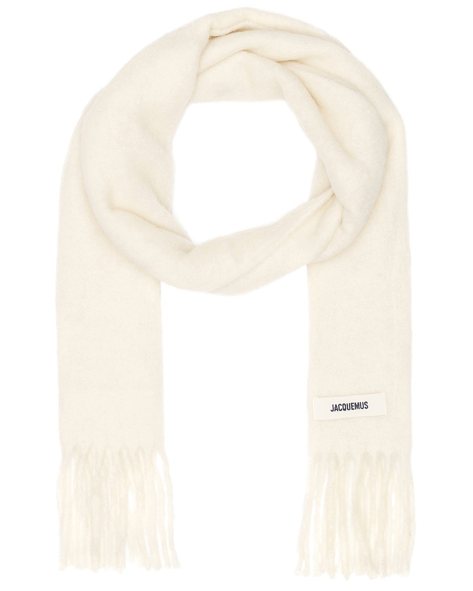 Details - 28% alpaca, 28% mohair, 24% virgin wool, 20% polyamide - Made in Italy - Dry clean only - Fringed ends - Logo detail - Measures approx 249 cm W x 39 cm H - Our Style No. JQUF-WA178 - Manufacturer Style No. 24H236AC688-5087