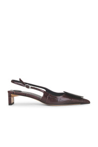 Details - Croc-embossed leather upper and sole - Made in Italy - Sling back styling with adjustable buckle closure - Leather lining - Circle and square leather embellishments at toe - Pointed toe - Square heel with circle and square pads at heels - Approx 40mm/ 1.5 inch heel - Our Style No. JQUF-WZ115 - Manufacturer Style No. 241FO076-3164