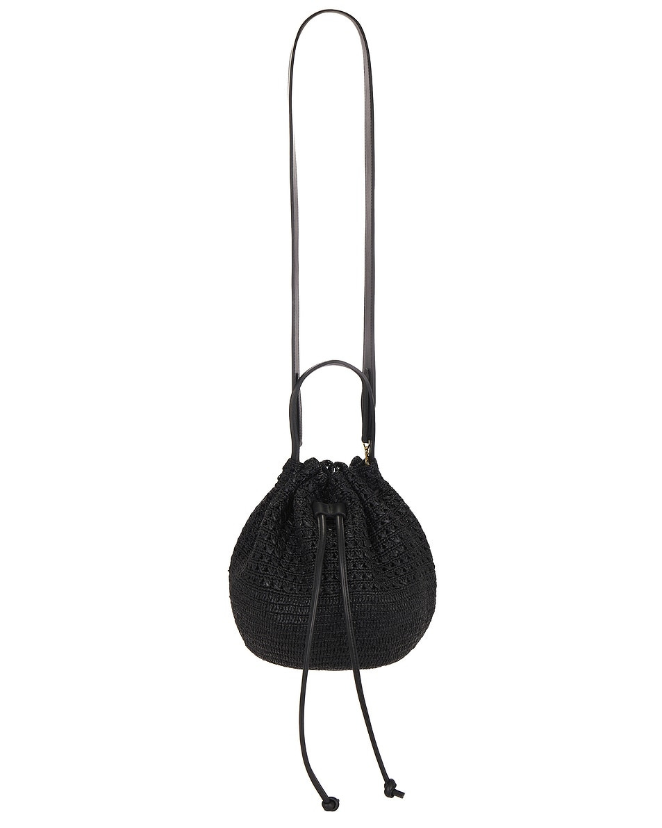 Details - Raffia exterior and lining with leather trim - Top drawstring closure - One main compartment - Integrated leather handle - Detachable leather shoulder strap - Measures approx 18 cm W x 27 cm H x 18 cm D - Shoulder strap with a 56 cm drop - Top handle with a 15 cm drop - This item is not available to ship to Australia - Made in US - Our Style No. JNES-WY6 - Manufacturer Style No. PF23011B