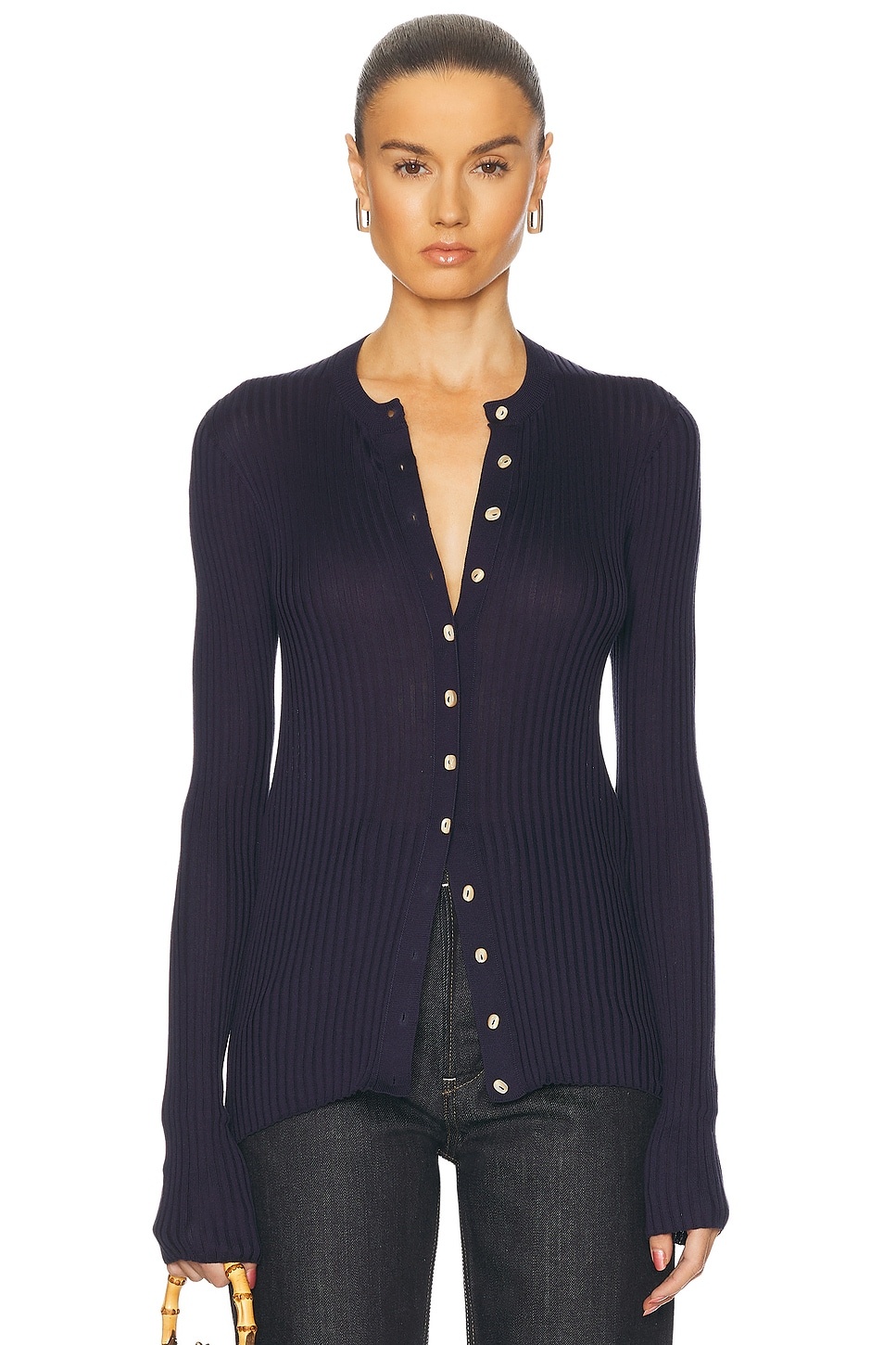 Details - 100% silk - Made in Italy - Dry clean only - Front button closure - Lightweight ribbed knit fabric - Our Style No. JILS-WK54 - Manufacturer Style No. J04HP0006-J16137-402