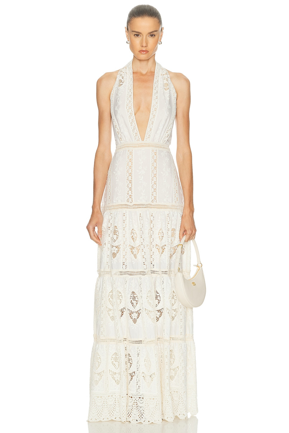 Details - 100% polyester - Made in Colombia - Dry clean - Partially lined - Hidden zipper closure at back - Self-tie halterneck closure - Embroidered poplin textile with eyelet details - Our Style No. JOTZ-WD250 - Manufacturer Style No. PT03173