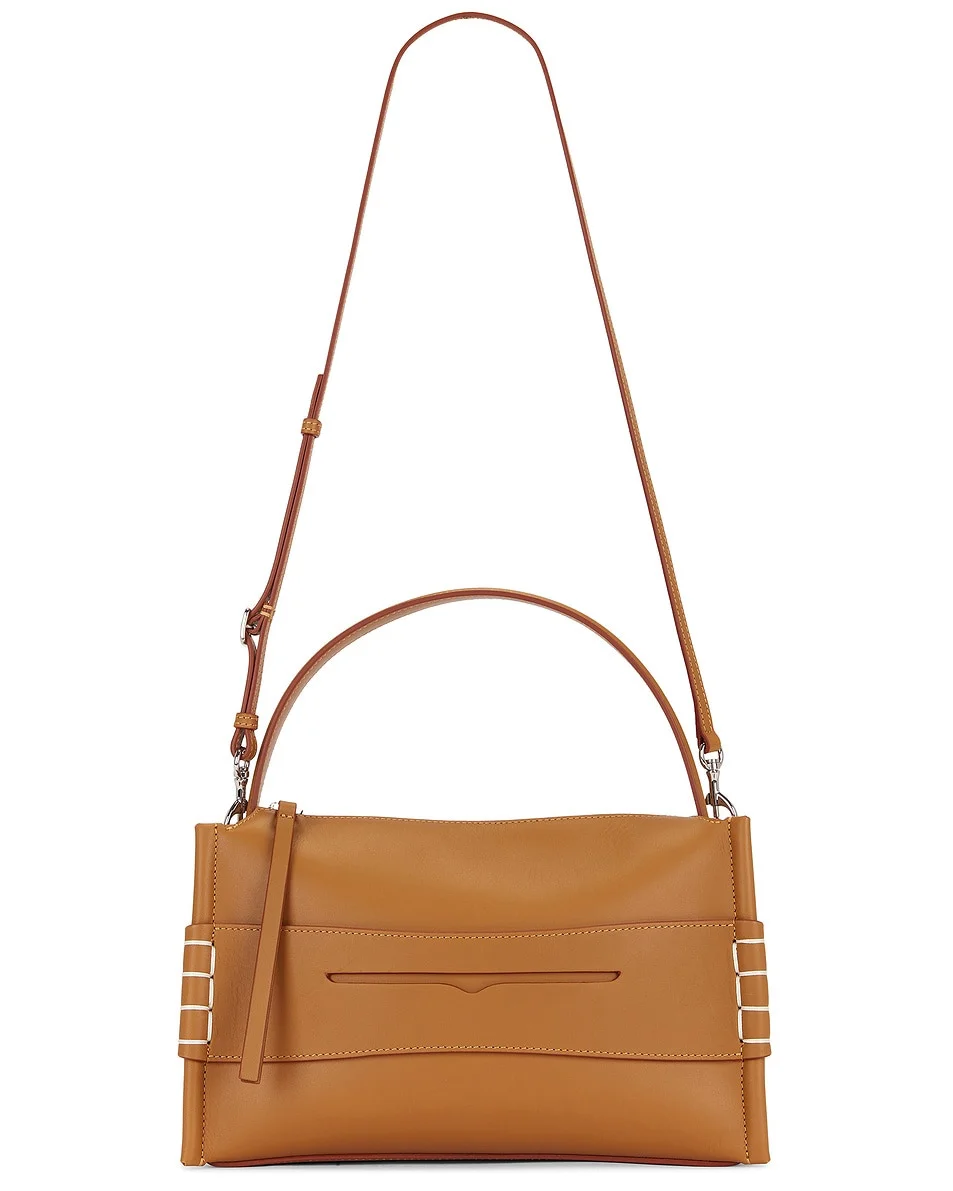 Details - Suede-inspired smooth calf leather exterior with loafer-inspired front panel and white topstitching - Top zip opening with branded puller - One main compartment with inner leather pocket and blind-logo embossing - Compact, sculptural silhouette that mimics the sole and welt of a loafer - Top handle and adjustable/detachable leather crossbody strap - Measures approx 29 cm W X 21 cm H X 8 cm D - Crossbody strap with a 46 cm-48 cm drop - Top handle with a 13 cm drop - Made in Italy - Our Style No. JWAF-WY52 - Manufacturer Style No. HB0716-LA0360
