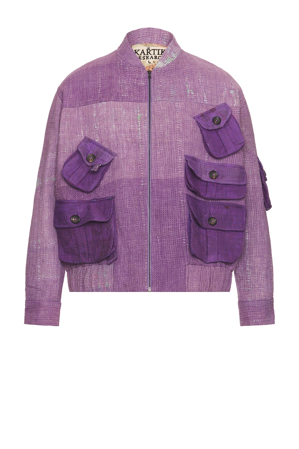 Details - 100% cotton Vintage Kantha Overdye - Dry clean only - Front zipper closure - 5-pocket design - Flap pocket at arm - Distressed linen fabric - Please note, fabric design and color is unique on every piece - Made in India - Our Style No. KRCF-MO7 - Manufacturer Style No. SS25-17