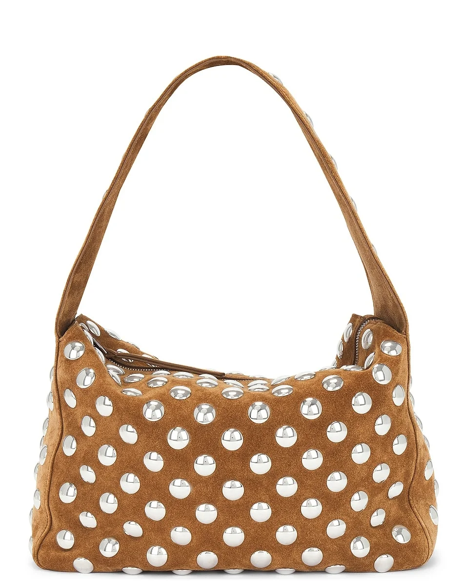 Details - Suede exterior with silver-tone studs and leather lining - Made in Italy - Top zipper closure - One main compartment - Interior card slot - Measures approx 27 cm W x 18 cm H x 9 cm D - Shoulder strap with a 14 cm drop - Our Style No. KTAH-WY129 - Manufacturer Style No. H2025-849