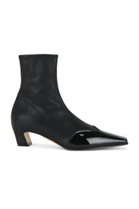 Details - Nappa leather with patent calfskin leather upper and leather sole - Inner side zip closure - Cushioned leather footbed and lining - Pointed square toe - Sculptural heel - Approx 45.72mm/ 1.8 inch heel - Approx 158.75mm/ 6.25 inch shaft - Opening measures approx 26 cm in circumference - Made in Italy - Our Style No. KTAH-WZ198 - Manufacturer Style No. F1068-971