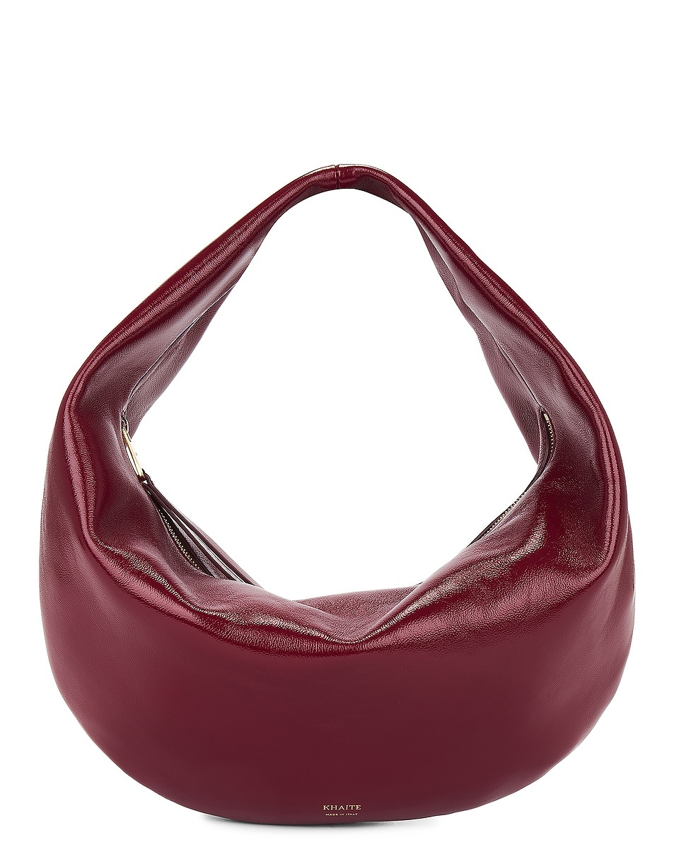 Details - Patent leather exterior with foiled Khaite logo and suede lining - Made in Italy - Top zipper closure - One main compartment - Measures approx 36 cm W x 18 cm H x 10 cm D - Shoulder strap with a 9 cm drop - Our Style No. KTAH-WY126 - Manufacturer Style No. H6015-877