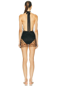 Details - Self 1: 65% polyamide, 35% viscose - Self 2: 90% silk, 10% elastane - Dry clean only - Halterneck tie-up closure - Lace fabric - Garment is intentionally sheer, undergarments will show through. - Please note undergarment not included - Made in China - Our Style No. KSSF-WI111 - Manufacturer Style No. P252DR126