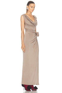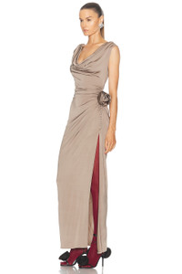 Details - 95% viscose, 5% elastane - Made in Poland - Dry clean only - Unlined - Side button loop closure - Cowl-neckline - Ruching at side with 3D floral accent - Slinky jersey fabric with side slit - Our Style No. MAGF-WD104 - Manufacturer Style No. 173724