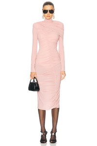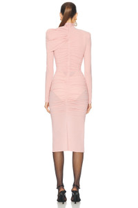 Details - Self 1: 85% silk, 15% elastane - Self 2: 100% cotton - Made in Poland - Dry clean only - Lined with bodysuit - Hidden back zipper closure - Gusset button snap closure - Turtleneck styling - Padding at shoulders - Jersey fabric with ruching detail - Our Style No. MAGF-WD123 - Manufacturer Style No. 205425