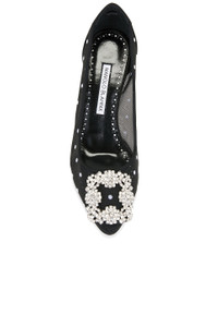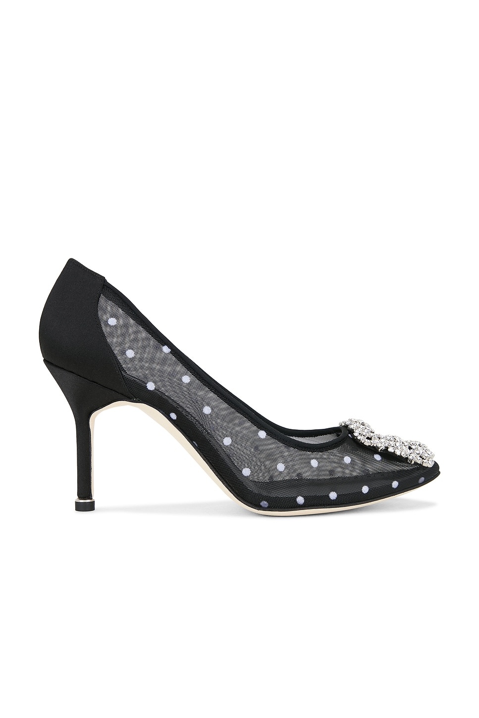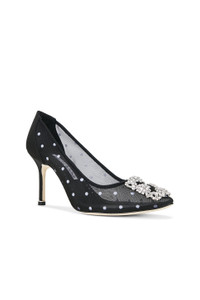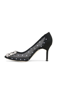 Details - Mesh and satin upper with buffed leather sole - Slip-on styling - Leather lining - Crystal embellished square buckle - Pointed toe - Stiletto heel - Approx 90mm/ 3.5 inch heel - Made in Italy - Our Style No. MNIF-WZ500 - Manufacturer Style No. 225-1925