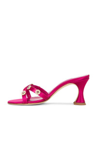 Details - Satin upper with calf leather sole - Slip-on styling - Kid leather lining - Jewel and pearl embellished upper - Almond toe - Flare heel - Approx 70mm/ 2.75 inch heel - Made in Italy - Our Style No. MNIF-WZ504 - Manufacturer Style No. 225-1869