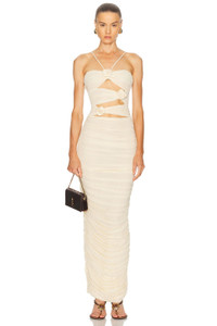 Veranera appliquéd ruched cutout stretch-jersey halterneck maxi dress Beige