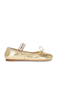 Details - Metallic snakeskin upper with leather sole - Made in Italy - Slip-on styling - Elastic strap with Miu Miu patch - Bow detail at toe - Squared round toe - Our Style No. MIUF-WZ137 - Manufacturer Style No. 5F794D FDX05