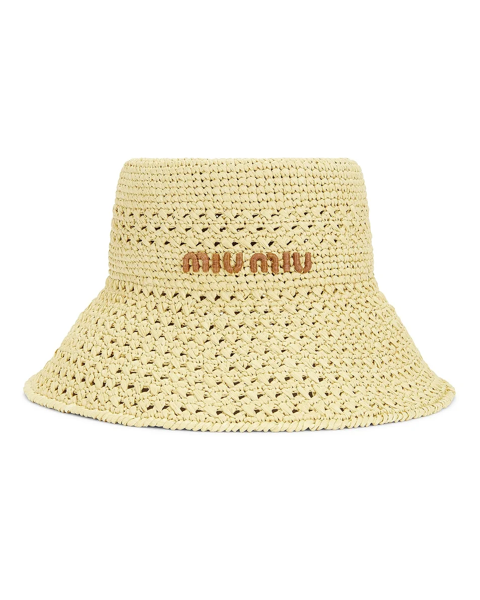 Details - Crocheted raffia hat - Made in Madagascar - Adjustable chin strap - Wide brim - Flat top - Embroidered Miu Miu logo - Brim measures approx 10 cm in length - This item is not available to ship to Australia - Our Style No. MIUF-WA203 - Manufacturer Style No. 5HC288