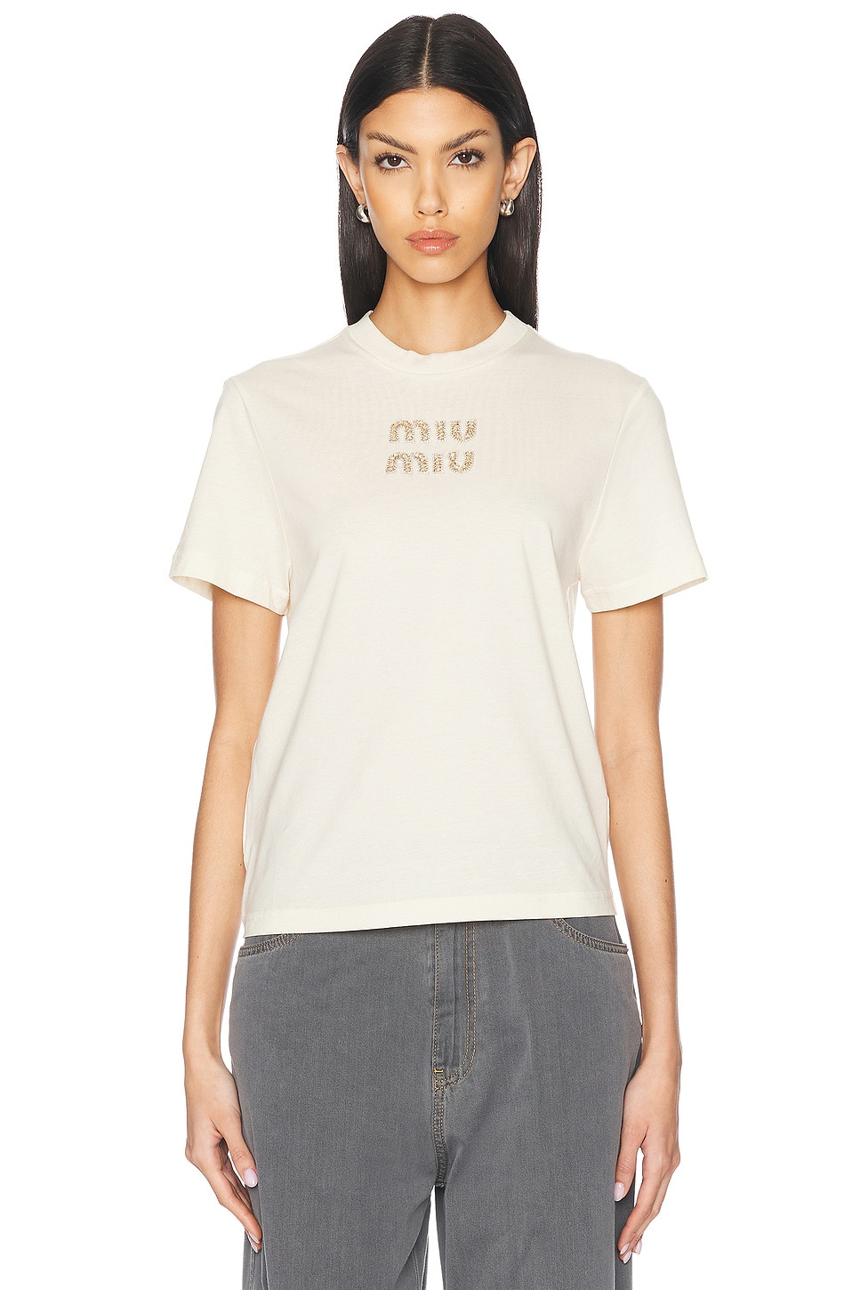 Details - 100% cotton - Made in Italy - Dry clean only - Rhinestone and beaded embellished logo detail - This item is not available for international export - Our Style No. MIUF-WS154 - Manufacturer Style No. MJN499