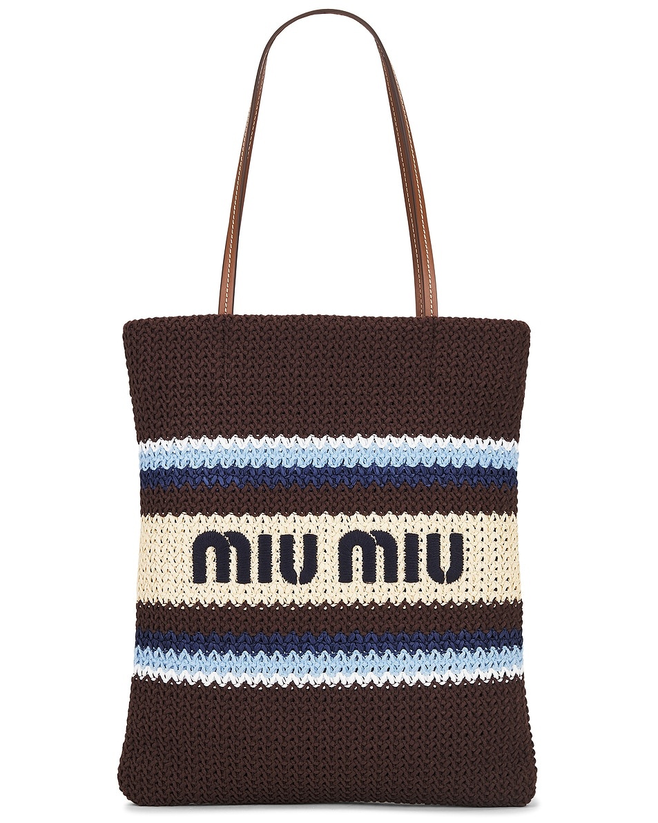 Details - Unlined raffia-effect cotton bag - Made in Italy - Open top styling - One main compartment - Interior zipper pocket - Leather shoulder straps - Embroidered logo front - This item is not available for international export. This item is not available to ship to Australia - Our Style No. MIUF-WY165 - Manufacturer Style No. 5BG248