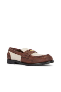 Details - Leather and linen upper with manmade sole - Made in Italy - Slip-on styling - Leather footbed and lining - Gold-tone hardware at penny strap - Tonal debossed Miu Miu logo at tongue - Approx 13mm/ 0.75 inch heel - Our Style No. MIUF-WZ152 - Manufacturer Style No. 5D168E