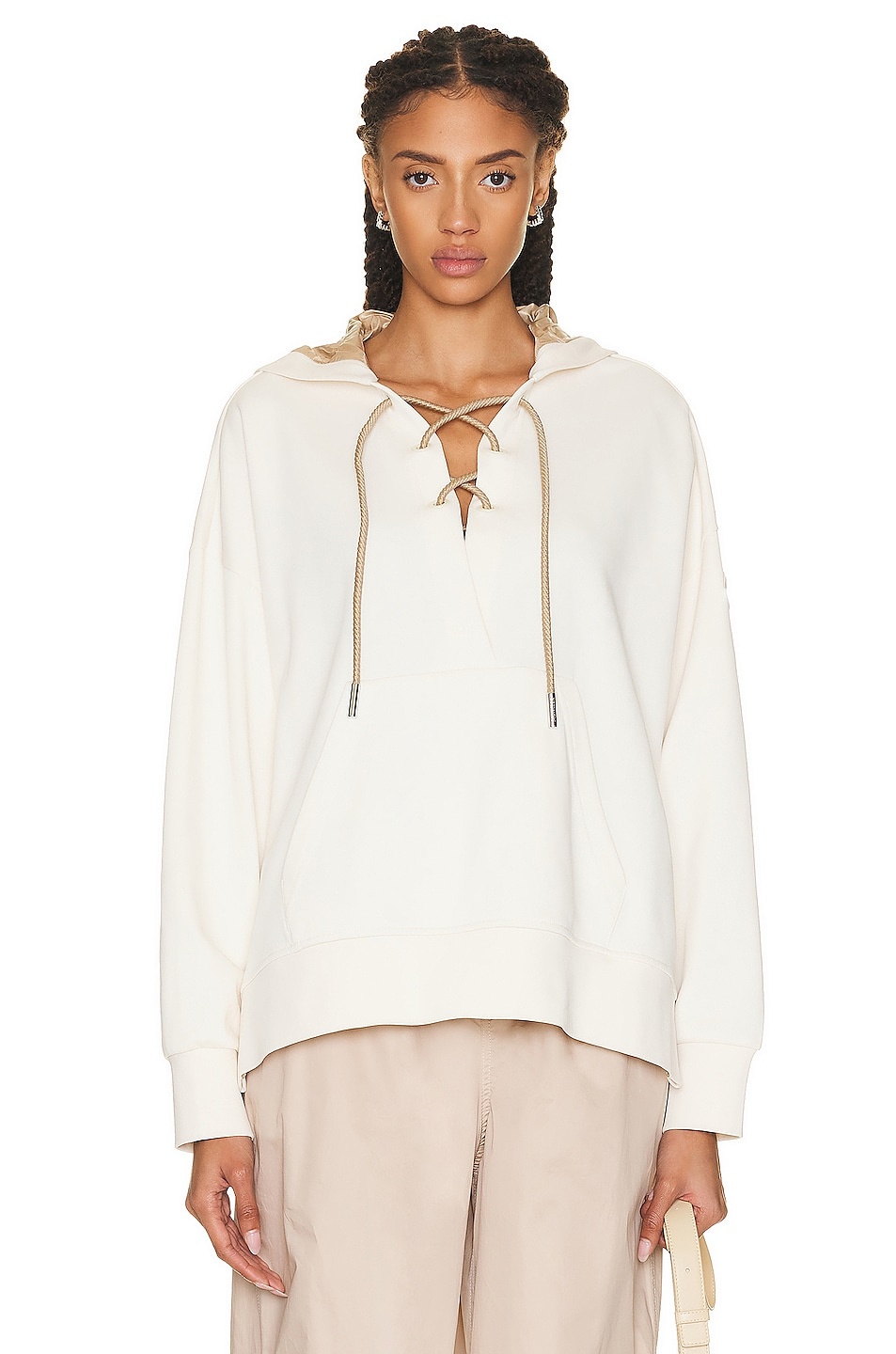 Details - Self: 91% cotton, 9% polyamide - Hood Lining: 100% polyamide - Made in Turkey - Hand wash - Grommet lace-up front - Kangaroo pocket - Side slits - Moncler logo at sleeves - Our Style No. MONC-WK34 - Manufacturer Style No. I10938G00041899TR
