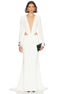 Details - 100% polyester - Made in Lebanon - Dry clean only - Fully lined - Halterneck hook and eye closure - Hidden back zipper closure - Padding at shoulders - Plunging neckline at front and cut-out detail at back - Crepe fabric with hi-low hem - Our Style No. MNOX-WD63 - Manufacturer Style No. 25S816