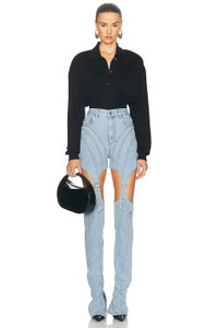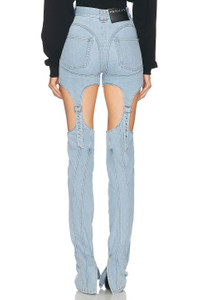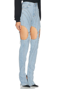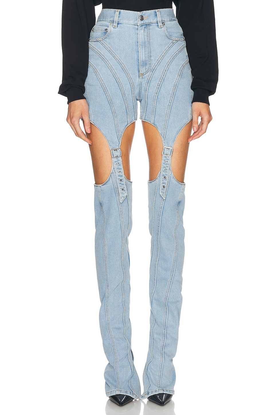 Details - Self: 72% cotton, 28% lycra - Lining: 65% polyester, 35% cotton - Made in Italy - Dry clean only - Zip fly with button closure - 5-pocket design - Cut-out design with buckle accent - Logo detail at back waist - Our Style No. MUGL-WJ19 - Manufacturer Style No. 24F6PA0471211