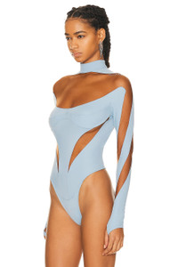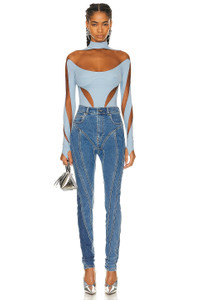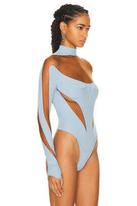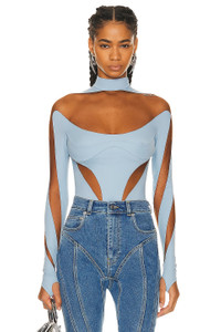 Details - Self: 78% polyamide, 22% elastane - Lining: 77% polyamide, 23% elastane - Made in Portugal - Machine wash - Gusset snap button closure - Hidden back zipper closure - Thumbhole cut-out - Chrome Mugler logo hardware at shoulder - Stretch jersey fabric with sheer mesh panels - Our Style No. MUGL-WS99 - Manufacturer Style No. 23S1BO0192842