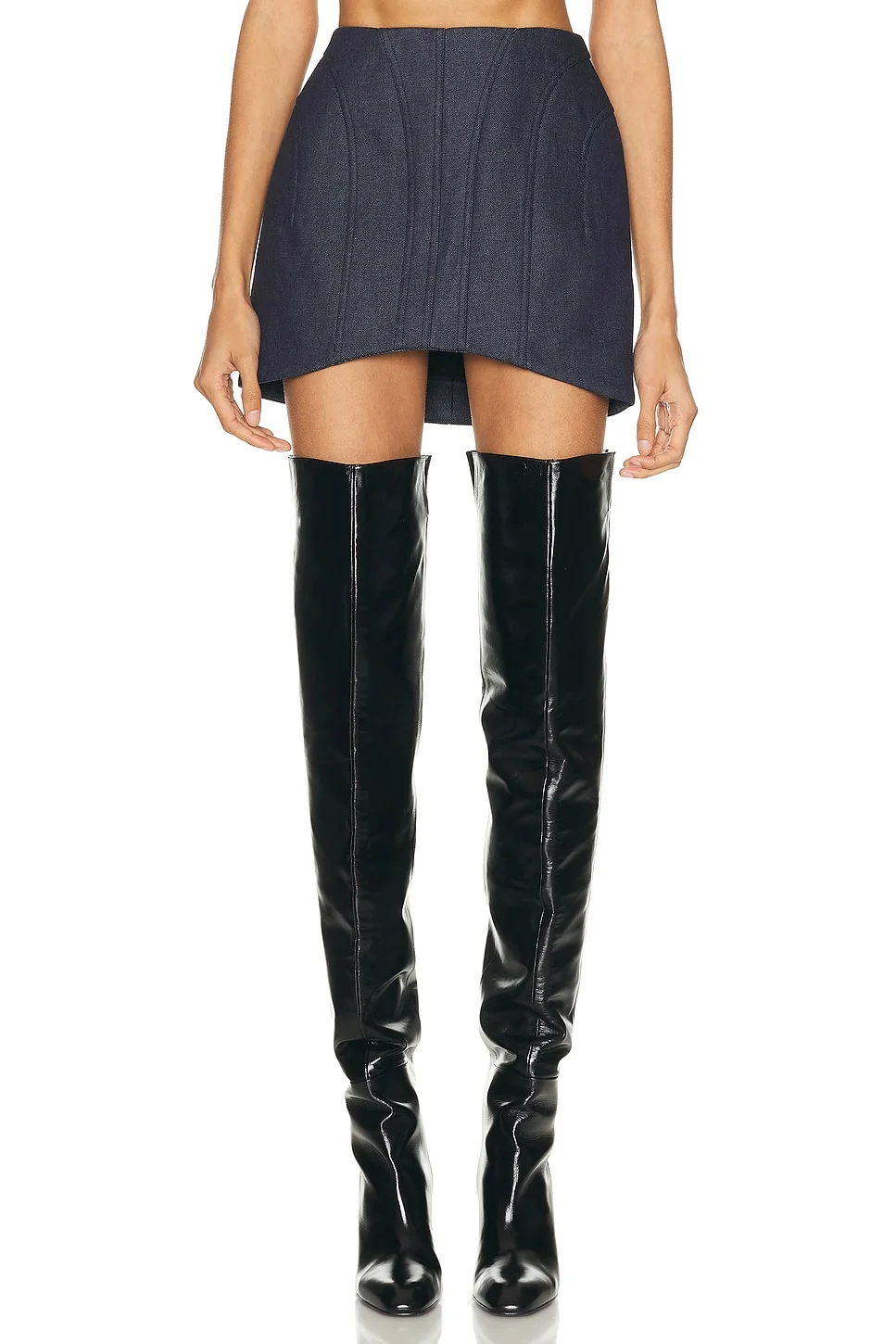 Details - Self: 52% organic cotton, 48% cotton - Lining: 100% cotton - Made in Ukraine - Machine wash cold or dry clean - Fully lined - Back zip and eyelet closure - Rigid denim fabric - Padded hips - Our Style No. MUGL-WQ34 - Manufacturer Style No. 25F6JU05682014