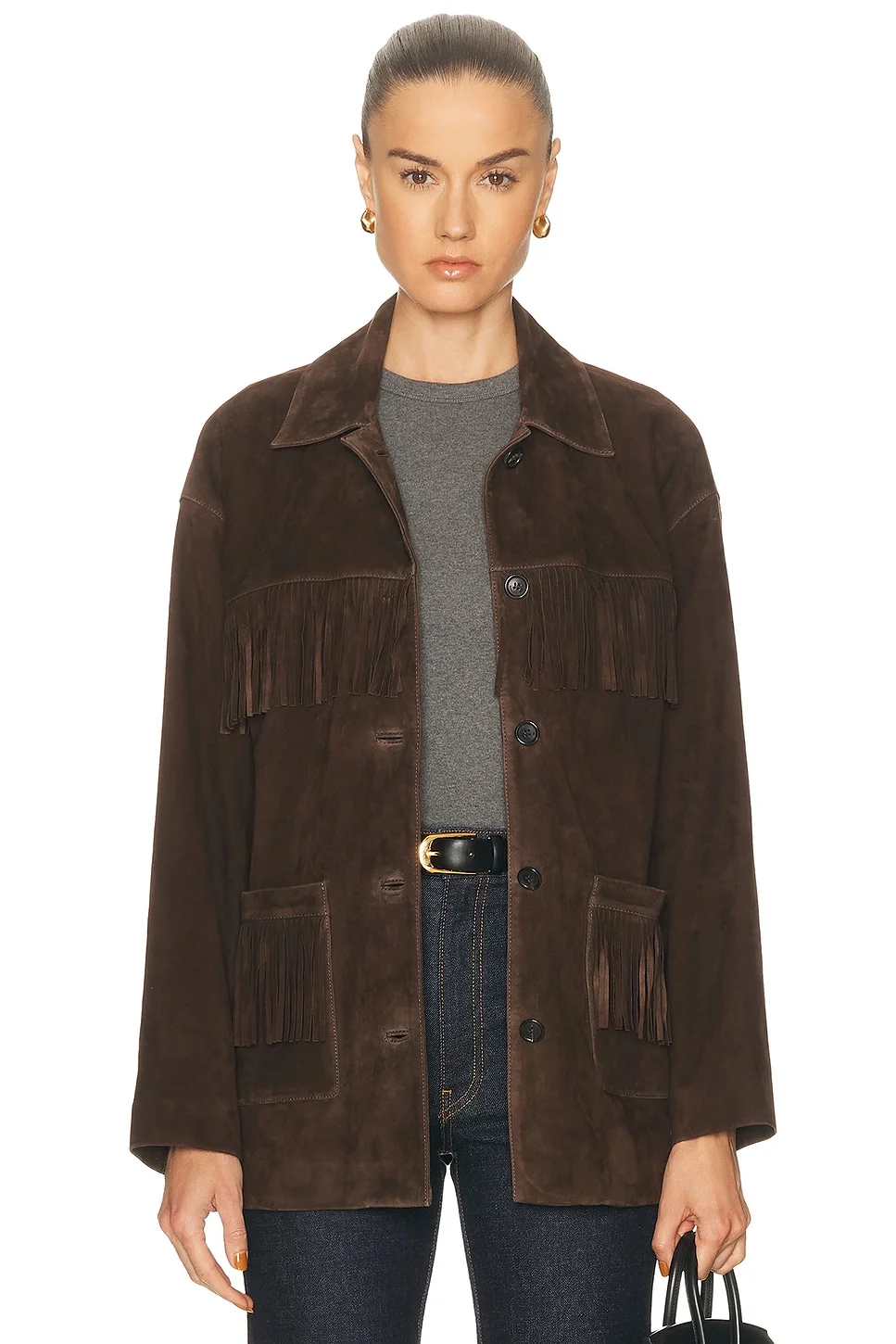 Details - Self: 100% goat suede - Lining: 100% viscose - Professional leather clean only - Front button closure - Front slip pockets - Front and back fringed detailing - Heavyweight suede fabric - Made in Turkey - Our Style No. NILF-WO171 - Manufacturer Style No. 13480-L238