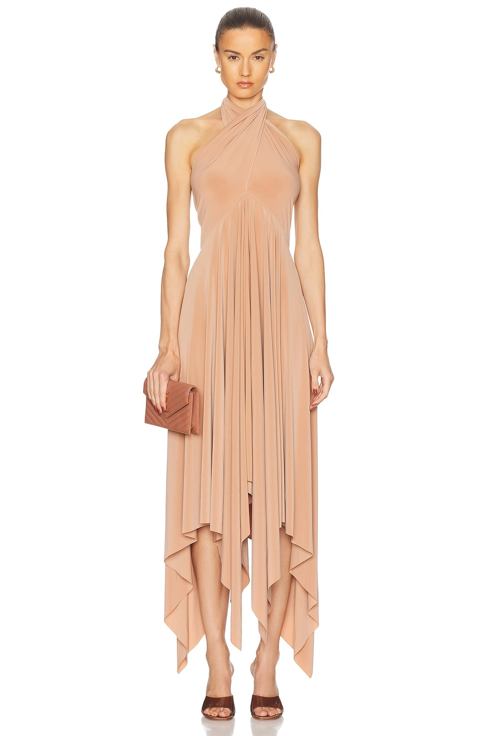 Details - 95% polyester, 5% spandex - Made in China - Machine wash - Fully lined - Halterneck tie-up closure - Convertible styling - Slinky jersey fabric with asymmetrical hem - style runs large, size down - Our Style No. NOMF-WD616 - Manufacturer Style No. KK1253PLO62833