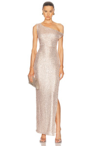 One-shoulder sequined stretch-mesh maxi dress Gold