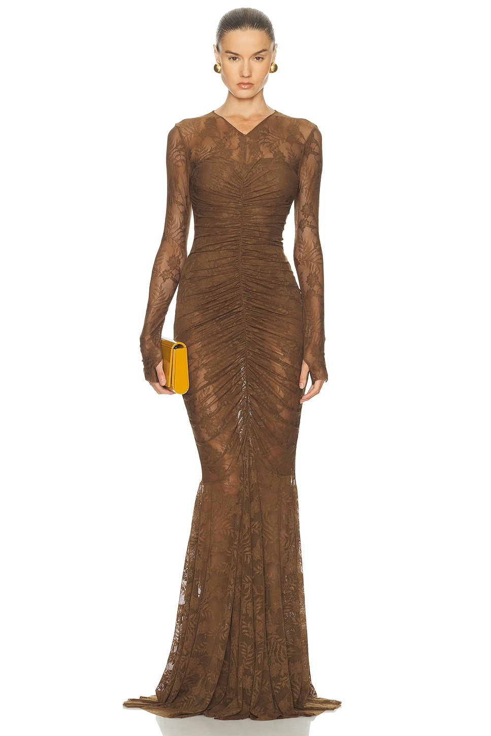 Long Sleeve V Neck Shirred Front Fishtail Gown