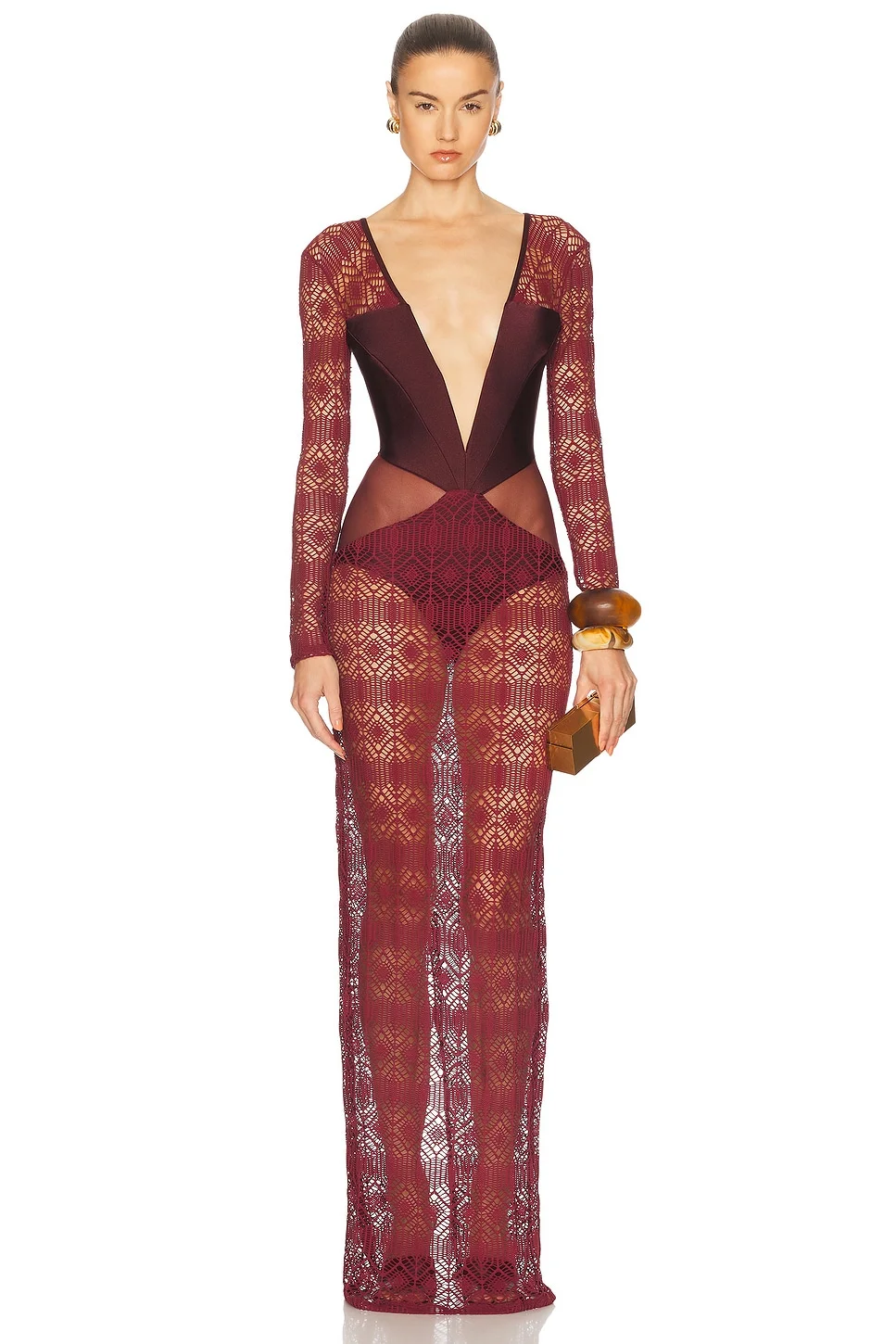 Details - Self 1: 93% polyamide, 7% elastane - Self 2: 85% polyamide, 15% elastane - Lining: 81% polyamide, 19% elastane - Made in Brazil - Hand wash - Partially lined - Halterneck tie-up closure - Hidden back zipper closure - Gusset button snap closure - Plunging front and back neckline - Jersey and crochet fabric design - Garment is intentionally sheer, undergarments will show through - Our Style No. PTAB-WD306 - Manufacturer Style No. VEL31651