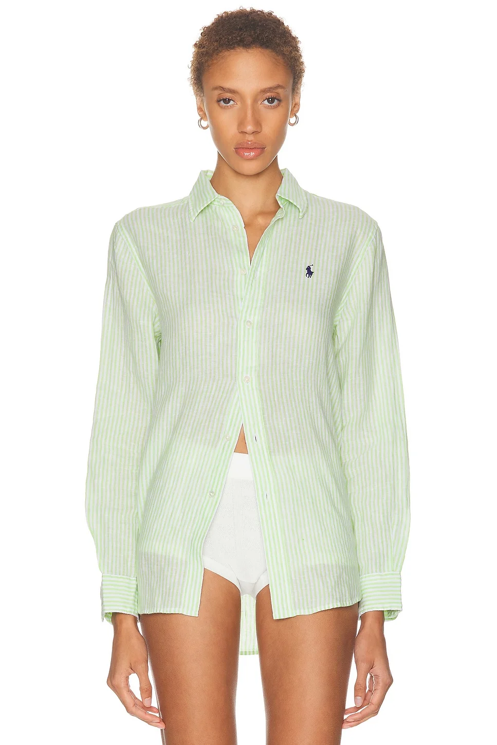 Details - 100% linen - Machine wash - Front button closure - Front embroidered logo - Button cuffs - Midweight linen fabric - Garment is made with a semi-sheer fabric, undergarments can show through - Made in Cambodia - Our Style No. PLAU-WS73 - Manufacturer Style No. 211A96158001