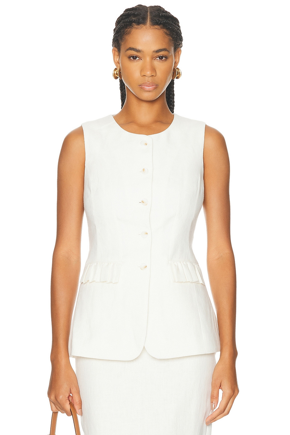Details - Self: 100% linen - Lining: 100% cotton - Dry clean only - Front button closure - Front faux ruffle flap pockets - Midweight linen fabric - Item not sold as a set - Made in China - Our Style No. PSSF-WS31 - Manufacturer Style No. PS1335-CRM