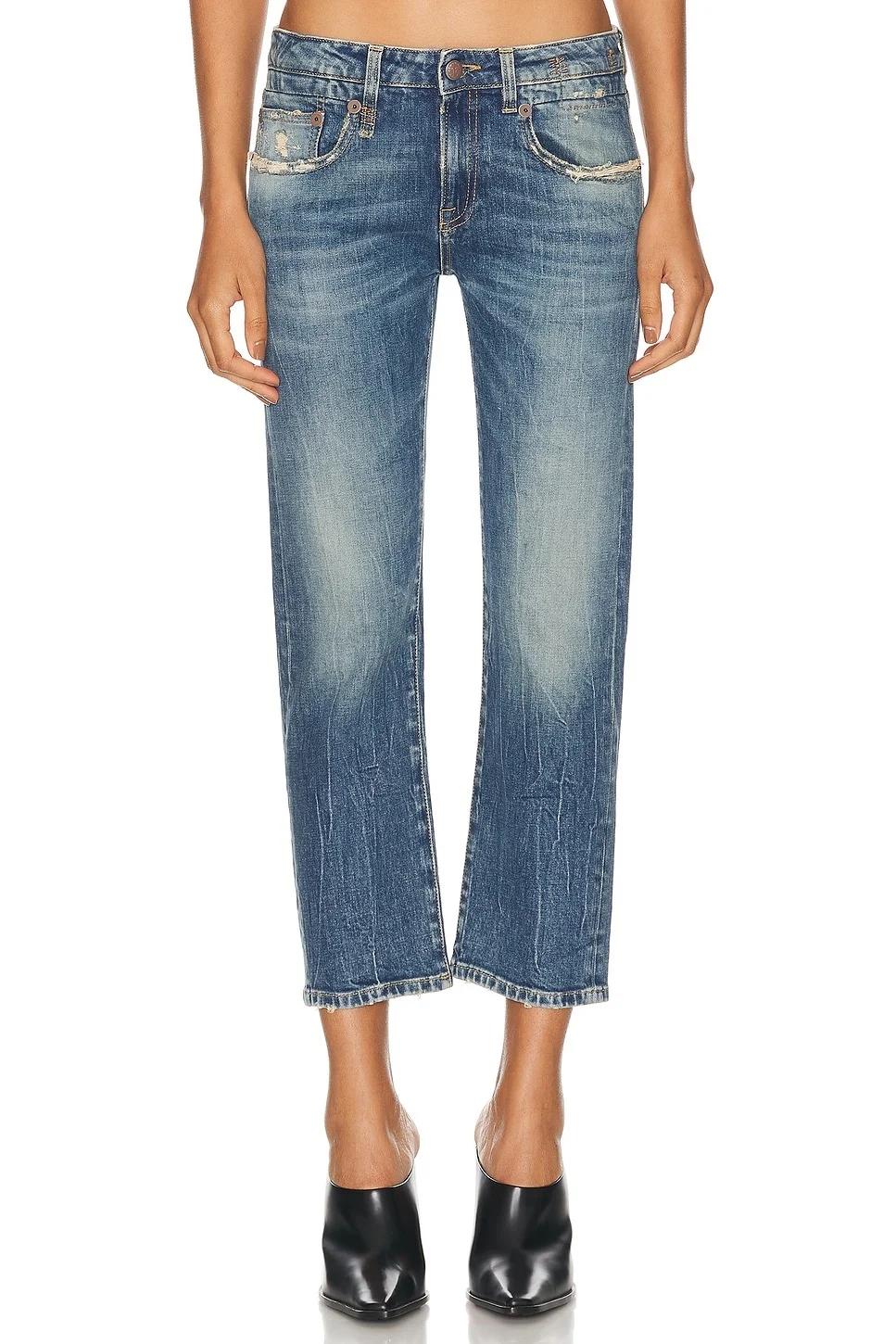 Details - Denim textile - Imported - Machine wash recommended - Zip fly with button closure - 5-pocket design - Intentionally distressed areas - Heavy whiskering and fading detail - Lightweight fabric - Our Style No. R13-WJ307 - Manufacturer Style No. R13W0091-D081A