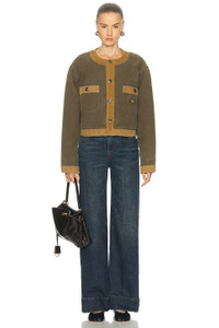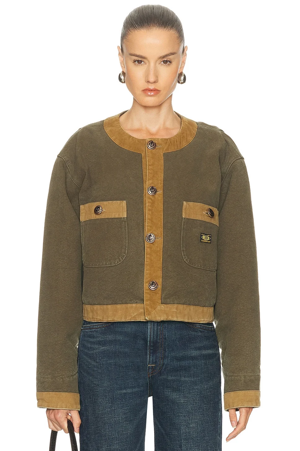 Details - Self 1: 100% cotton - Self 2: 100% leather - Lining: 100% polyester - Machine wash - Front button closure - Front pouch pockets with button closures - Twill fabric with corduroy trim and light padding - Made in Italy - Our Style No. R13-WO195 - Manufacturer Style No. R13WD063-D375A