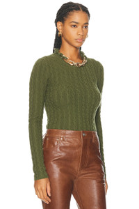 Details - 80% wool, 10% cashmere, 10% elastane - Dry clean only - Pull-on styling - Attached gold-tone chain at neckline with toggle closure - Ribbed trim - Heavyweight cable knit fabric - Made in China - Our Style No. PCRB-WK23 - Manufacturer Style No. 25AMPU049ML0320