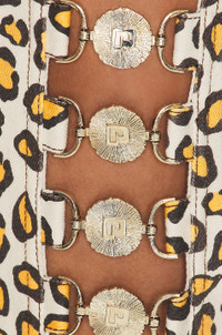Details - Cotton blend - Imported - Dry clean recommended - Zip fly with button closure - 5-pocket design - Laddered cut-out with gold-tone logo accents - Our Style No. PCRB-WP27 - Manufacturer Style No. 23FCPA277CO0382