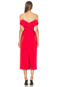 Details - Self: 95% polyester, 5% elastane - Lining: 100% polyester - Made in China - Spot clean only - Fully lined - Hidden back zipper closure - Off-shoulder design with ruched fabric - Satin fabric and back slit - Our Style No. RERF-WD38 - Manufacturer Style No. 24PFRG61581.RES