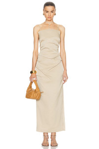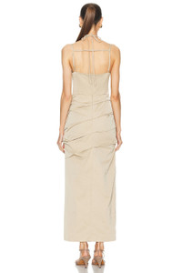 Details - 58% polyester, 42% cotton - Made in China - Dry clean only - Unlined - Hidden back zipper closure with tie at neck - Ruched design - Side slit - Our Style No. RERF-WD34 - Manufacturer Style No. 24FRG61774.TAN
