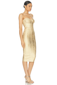 Details - 100% polyester - Made in China - Dry clean only - Unlined - Exposed back zipper closure - Bustier design - Ponte knit fabric with metallic coating - Our Style No. RTFF-WD565 - Manufacturer Style No. FW23-7685