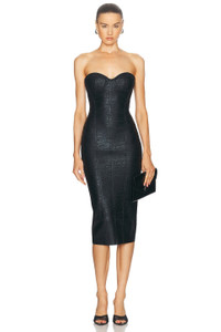 Details - 100% polyester - Made in China - Dry clean only - Unlined - Exposed two-way back zipper closure - Bustier design at bodice - Coated ponte knit fabric - Our Style No. RTFF-WD566 - Manufacturer Style No. FW23-7685