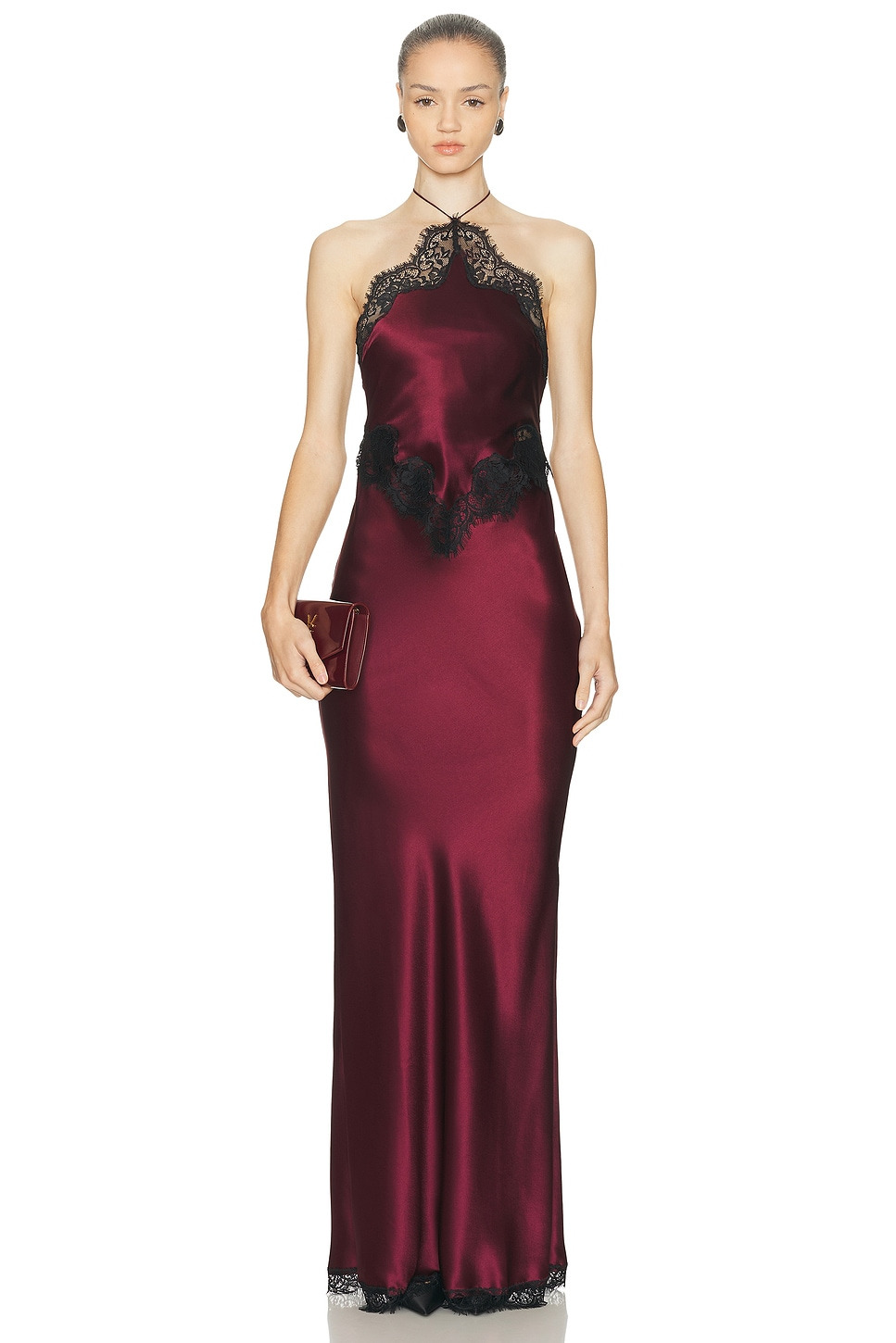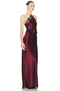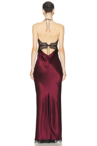 Details - Self 1: 76% acetate, 24% polyester - Self 2: 100% nylon - Lining: 97% polyester, 3% spandex - Dry clean only - Partially lined - Halterneck and back tie-up closures - Hidden back zipper closure - Satin fabric with lace detail - Made in China - Our Style No. RTFF-WD686 - Manufacturer Style No. R-PF25-11672-17