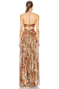 Details - Self: 78% silk, 22% metallic fibers - Lining: 100% polyester - Hand wash - Partially lined at bust - Hidden back zip and button loop closure - Halterneck styling with tie closure - Metallic thread detailing - Midweight satin fabric - Made in China - Our Style No. RTFF-WD661 - Manufacturer Style No. R-SS25-11347-17